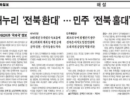 | 새누리당 최고위원회의, 전라일보는 극찬…전북도민일보는 ‘무늬만 최고위원회의’ 비판…새전북신문은 김완주 지사의 ‘소통부재’ 일방행정 또 반복 (2013/1/18) (0) | 2013.01.18 |