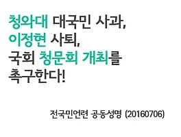 | [전국민언련 공동성명] 청와대 대국민 사과, 이정현 사퇴, 국회 청문회 개최를 촉구한다 (20160706) (0) | 2016.07.06 |