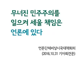 | [언론단체 비상시국 기자회견문] 무너진 민주주의를 일으켜 세울 책임은 언론에 있다 (2016.10.31) (0) | 2016.10.31 |