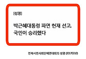 | [전북시민사회단체연대회의 성명] 박근혜대통령 파면 헌재 선고, 국민이 승리했다 (20170310) (0) | 2017.03.10 |