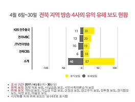 11자 전북 지역 신문 4곳도 마찬가지였다. 전북 지역 신문 4곳과 방송 4사는 주요 보도에서 ‘전북 지역 인사 홀대’와 ‘전북지역 역할론’을 다뤘으며 이는 전체 선거보도 129건 중 14건이다.