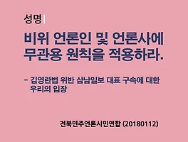 | 비위 언론인 및 언론사에 무관용 원칙을 적용하라 - 김영란법 위반 삼남일보 대표 구속에 대한 우리의 입장(20180112) (0) | 2018.01.12 |