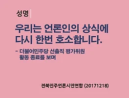 | 성명-더불어민주당 선출직 평가위원 활동 종료를 보며) 우리는 언론인의 상식에 다시 한번 호소합니다. (20171218) (0) | 2017.12.18 |