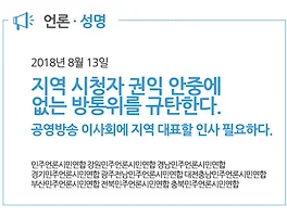 | [전국민언련 공동 성명] 지역 시청자 권익 안중에 없는 방통위를 규탄한다. (0) | 2018.08.13 |