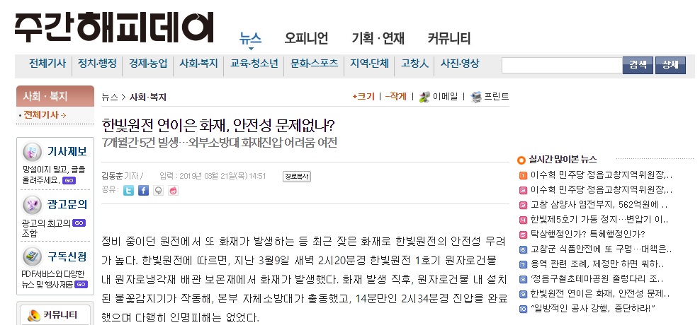 2. 한빛원전 연이은 화재, 안전성 문제없나? (3월 21일 보도, 6면, 김동훈 기자)