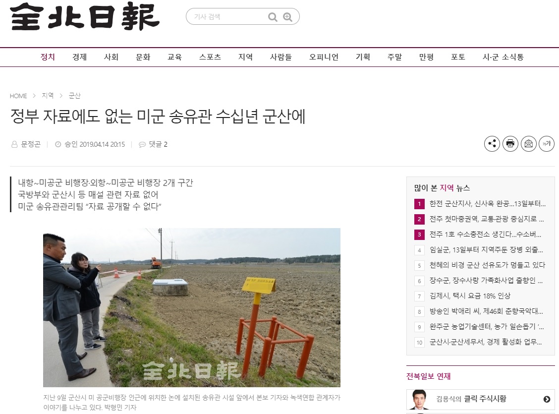 1. 정부 자료도 없는 미군 송유관 수십년 군산에 (4월 15일 보도, 1면, 군산=문정곤 기자)