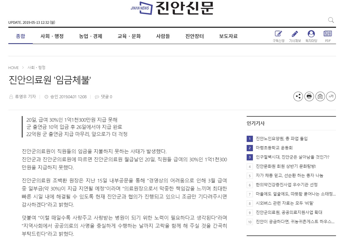2. 돈 있어도 ‘임금체불’한 진안의료원 (4월 8일 보도, 1면, 류영우 기자)