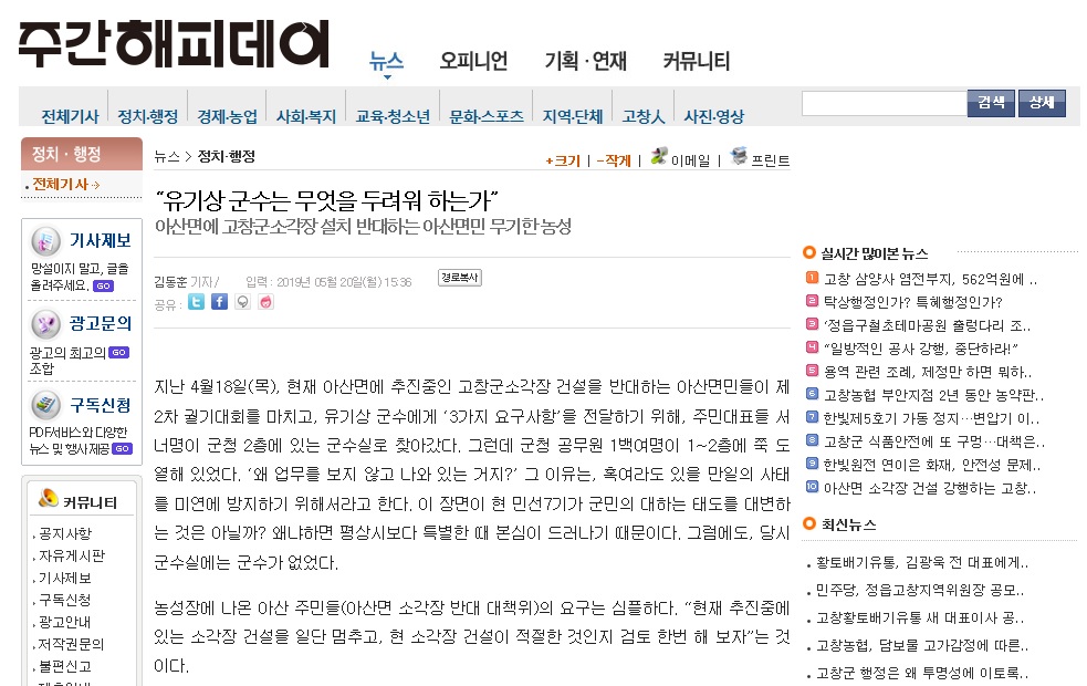 | 시민이 뽑은 『2019년 05월의 좋은 기사』 선정 결과 안내 <고창군 아산면 소각장 반대 여론 적극적 전달한 주간해피데이 보도> (0) | 2019.06.12 |