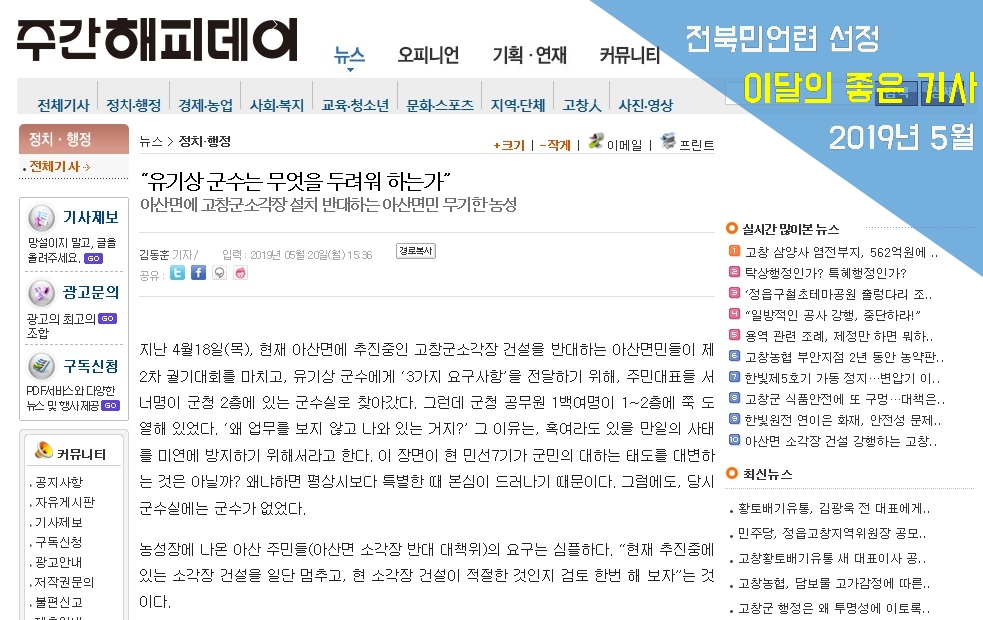 4개의 이달의 좋은 기사 후보 중 주간해피데이 김동훈 취재기자의 <고창군 아산면 소각장 반대 여론 적극적 전달한 주간해피데이 보도>가 33.3%로 2019년 05월의 좋은 기사로 선정되었음을 밝힙니다.