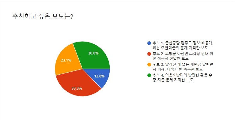 그 외에 투표에 참여해주신 다른 시민은 <군산공항 활주로 정보 비공개하는 주한미군의 문제 지적한 KBS전주총국 보도>에 대해 “주한미군의 오만한 태도에 대한 비판! 꼭 필요한 보도”라는 의견을 주셨습니다. 아쉽게 선정되지 못한 다른 좋은 기사 후보들에게도 많은 관심 부탁드립니다. 2019년 05월 이달의 좋은 기사는 06월 4일(화)~12일(수) 동안 E-메일과 페이스북 안내를 통한 시민들의 온라인 투표로 선정했습니다.