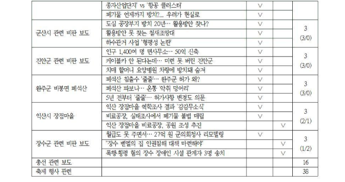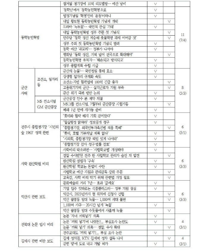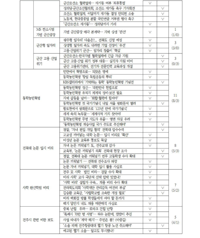 전북대 논문 입시비리, 완주군 비봉면 폐석산 문제, 전주시 관련 비판 보도, 진안군 요양원 이슈도 2군데 이상에서 주요하게 다룬 미디어 이슈로 드러났다.
