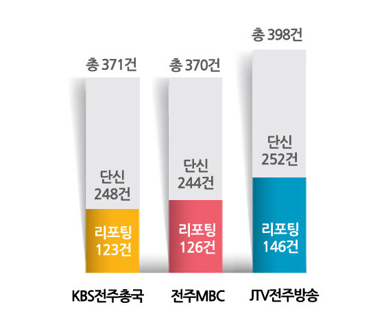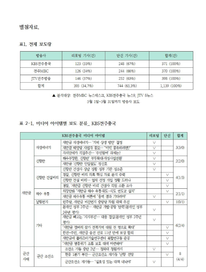 KBS전주총국 뉴스9, 전주MBC 뉴스데스크, JTV 8뉴스가 5월 1일~5월 31일까지 보도한 전체 기사 수는 1,139건이다. 리포팅 기사는 395건으로 34.7%, 단신 기사는 744건으로 65.3%다.