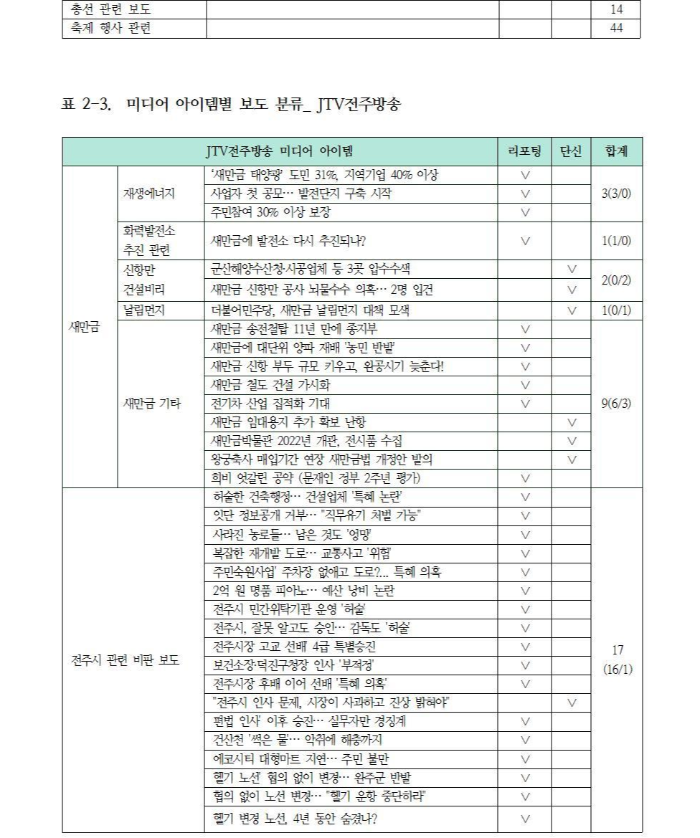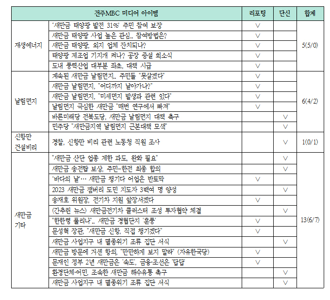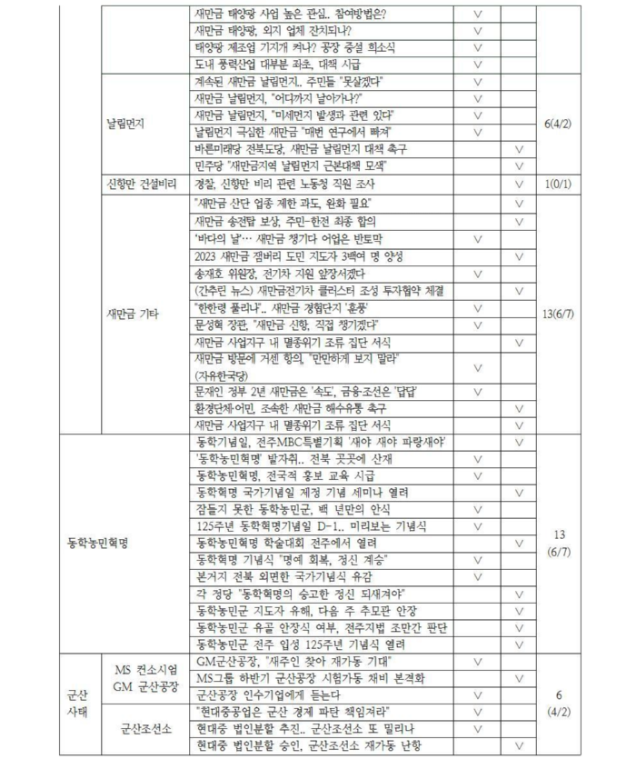 지역사회 내 이해관계 경합 사안에 대한 보도 프레임을 비교 분석했다. 해당 이슈의 속성 중 방송사에서 어떤 특정 속성을 강조하며 이슈에 대한 인식의 틀(프레임)을 고정시켰는지 확인할 수 있다. 이를 위해 우선 사전 모니터를 통해 선정된 ‘새만금’과 ‘군산 사태’ 미디어 이슈의 프레임을 분석했다.