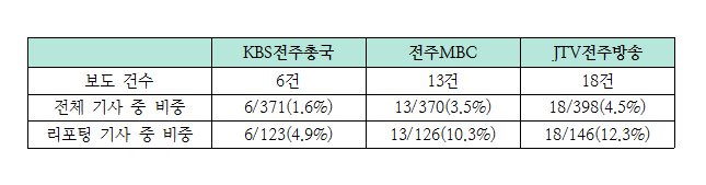 전주ㆍ익산ㆍ군산을 제외한 지역의 주요 의제를 얼마나 보도했는지 확인했다. 단순 지역명을 언급하거나 단신 보도, 축제 홍보성 내용의 보도는 제외했다. 전체적으로 KBS전주총국이 적은 보도량을 보이는 반면 전주MBC와 JTV는 전체 기사 비율로 봤을 때는 5%를 넘지 못하지만 리포팅 기사만의 비율로 놓고 봤을 때는 10%가 넘는 보도량을 보였다. 지역방송이 주류 공론장에서 배제되는 다양한 의제들을 다루는 통로로서 기능하고 있는지 점검할 필요가 있다.