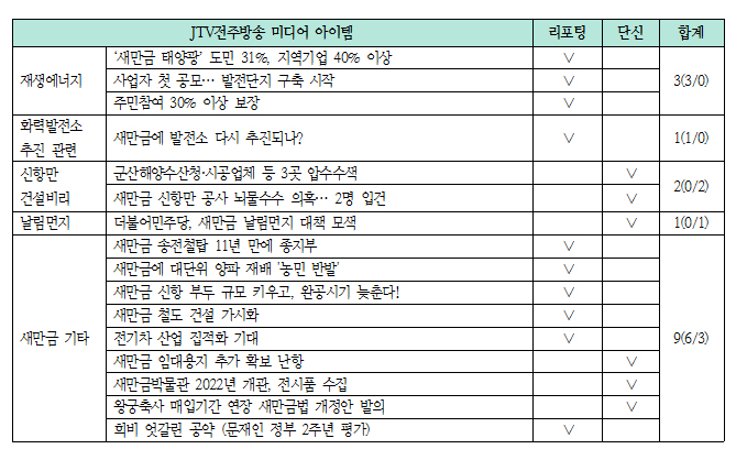 KBS전주총국과 전주MBC는 새만금이 가장 높은 보도 비중을 보였으나 속성 의제에서는 차이를 보였다. JTV는 전주시 관련 비판 보도에 집중했다.