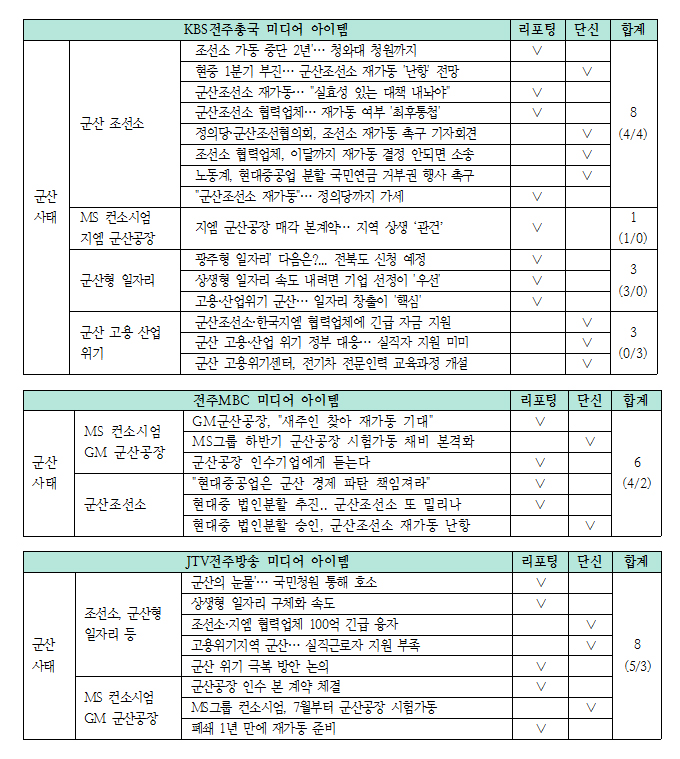 KBS전주총국은 가장 상세하게 진행상황을 전달하고 있다. 정부에서 상생형 지역 일자리 사업에 강한 추진 의사를 보이면서 군산형 일자리가 고용 산업 위기인 군산에서 대안이 될 수 있음을 강조하고 있다. 이 과정에서 전라북도와 지자체의 역할을 강조하고는 있지만 행정에서 실질적으로 무엇을 준비하고 있는지는 보도에서 확인되지 않는다.