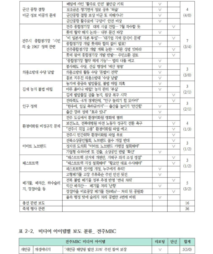 KBS전주총국과 전주MBC는 새만금이 가장 높은 보도 비중을 보였으나 속성 의제에서는 차이를 보였다. JTV는 전주시 관련 비판 보도에 집중했다.