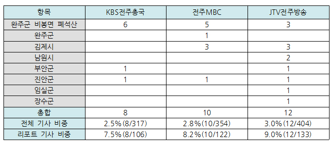 그나마 한 번이라도 언급된 타 지역과 달리 6월 한 달 동안 세 방송사에서 정읍시, 고창군, 무주군, 순창군 관련 주요 보도는 하나도 찾아볼 수 없었다. 지역방송이 주류 공론장에서 배제되는 다양한 의제들을 다루는 통로로서 기능하고 있는지 점검할 필요가 있다.