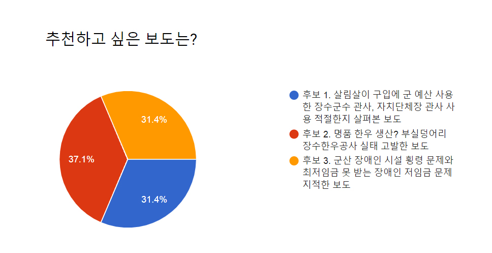 7월의 좋은 기사 후보로 오른 3건의 기사 중 KBS전주총국 길금희, 서승신 취재기자의 <명품 한우 생산? 부실덩어리 장수한우공사 실태 고발 보도>가 37.1%로 2019년 7월의 좋은 기사로 선정되었습니다.