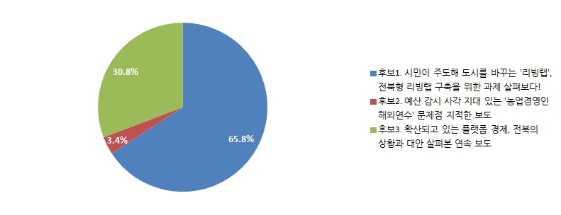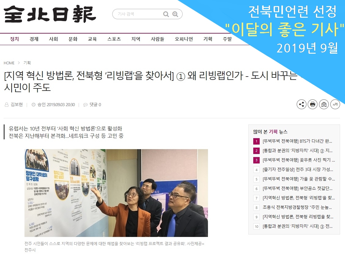 3개의 이달의 좋은 기사 후보 중 전북일보 김보현 취재기자의 <시민이 주도해 도시를 바꾸는 ‘리빙랩’, 전북형 리빙랩 구축을 위한 과제 살펴보다!>가 65.8%로 2019년 09월의 좋은 기사로 선정되었습니다.