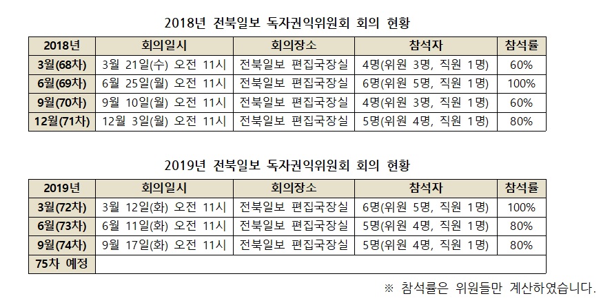 전북일보는 독자권익위원회라는 이름으로 운영하고 있으며, 1년에 총 4번씩 분기마다 회의를 진행하고 있습니다. 직원으로 편집국장이 회의에 같이 참석하고 있습니다. 2019년 4분기 회의는 아직 진행하지 않았습니다.