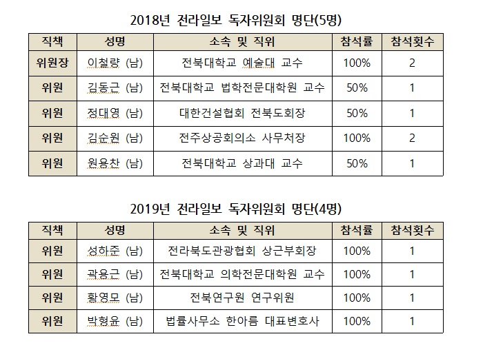 전북도민일보 독자위원회는 총 11명으로 구성되어 있습니다. 2019년 4월 김지혜, 김천환 위원이, 8월부터 김철승 위원이 새로 독자위원으로 선임되었으나, 기존 독자위원에서 사람만 바뀌었을 뿐 직책은 똑같이 유지되었기 때문에 사실상 연임이라고 볼 수 있습니다. 의료인임을 감안하더라도 권창영 예수병원장의 참석률이 다른 위원들에 비해 유난히 낮습니다.