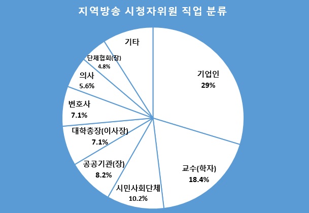 그러나 취지와 달리 선정된 위원들이 시청자를 대표한다고 보기 힘들었다. 2017~2019년 전국 지역방송 시청자위원(2017년 경남지역 미포함)들의 직업분석 결과 기업인이 29%로 가장 높은 비중을 차지했다. 이어 교수(학자) 18.4%, 시민사회단체 10.2%, 공공기관(장) 8.2%, 대학총장(이사장 포함)과 변호사가 각각 7.1%로 나타났다. 이 외에도 의사, 단체 협회장 비중이 높았다.