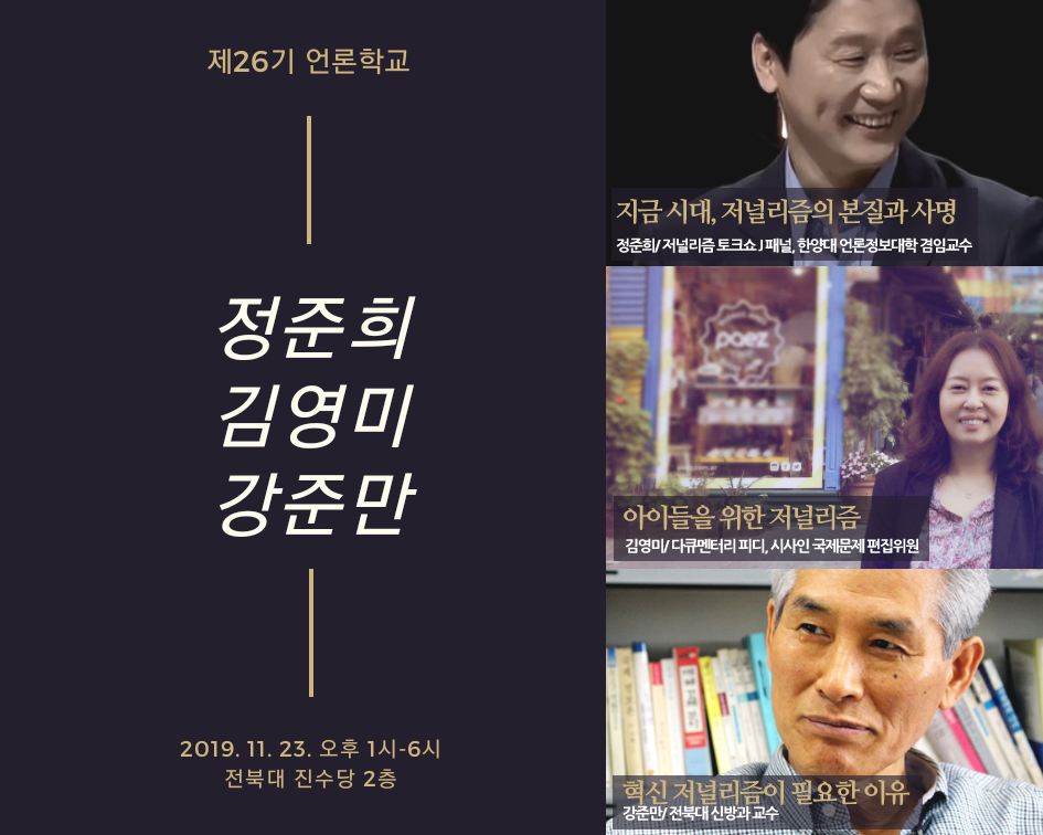 전주시민회 시절 언론분과에서 시작된 <언론학교>는 ‘참 언론 실천의 한마당’이라는 시대적 요구를 담고 매년 언론계의 현안과 대안을 찾는 강의 일정으로 시민들을 찾아갔습니다. 그간 주로 언론계 핫이슈를 중심으로 언론학교를 운영해 오긴 했지만 다양한 영역에서 치열하게 살아가시는 분들 가운데 한국 사회에 의미 있는 말씀을 해주실 수 있는 분들을 모시기도 했습니다.