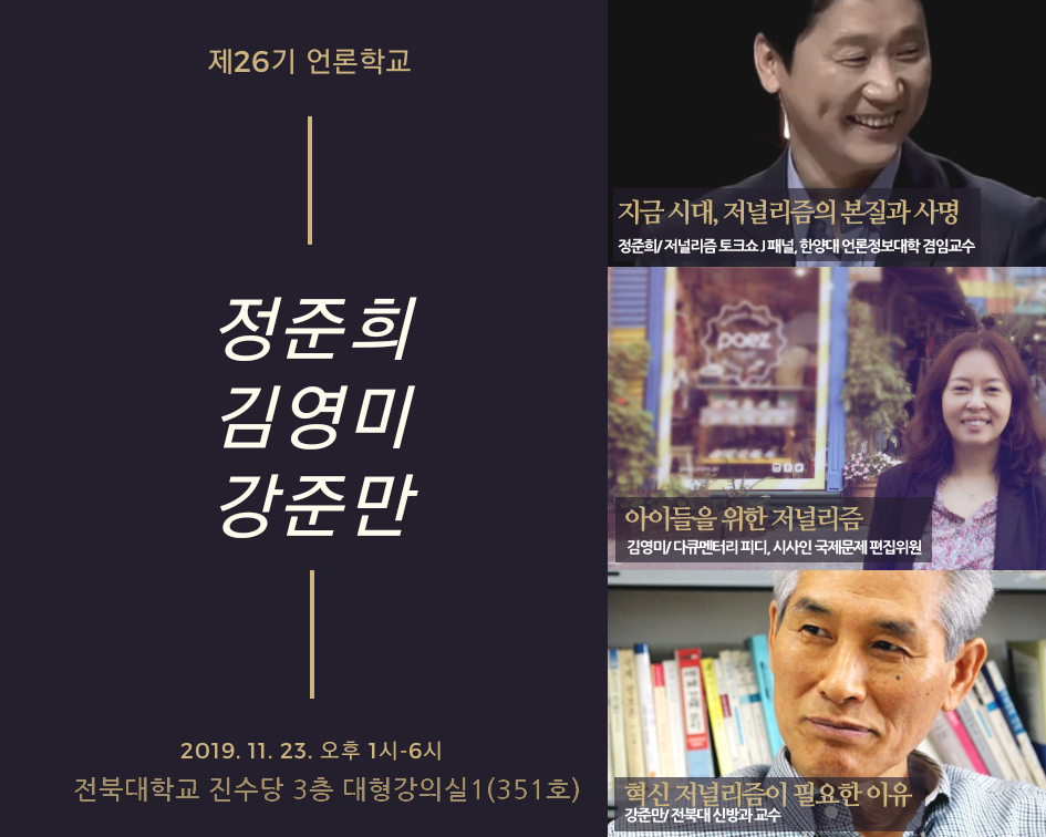 올해는 전북민언련 창립 20주년을 맞아 ‘다시 보고 싶은 언론학교 그 때 그 강사’ 투표를 진행하기도 했는데요, 그 결과 아래와 같이 강사 세 분을 모셨습니다.