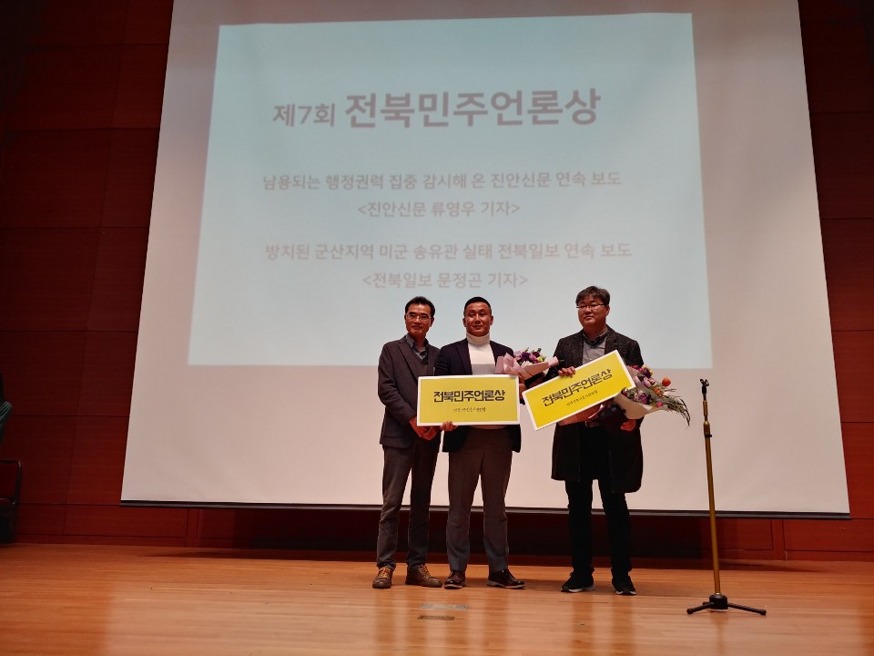 남용되는 행정권력 집중 감시해 온 진안신문 류영우 기자(사진 오른쪽)과 방치된 군산지역 미군 송유관 실태를 파헤친 전북일보 문정곤 기자(사진 가운데)가 공동으로 제7회 전북민주언론상을 받았습니다.