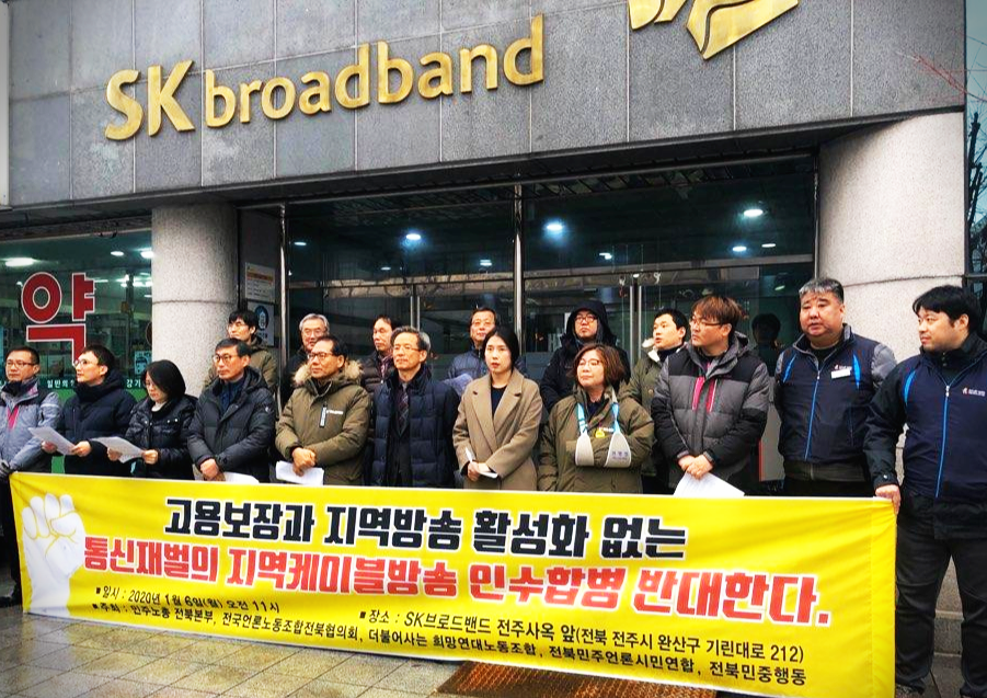 노동조합, 지역·사회운동단체들은 ‘방송통신 공공성 강화와 나쁜 인수합병 반대 공동행동’ 구성, 고용보장 및 비정규직 정규직화, 지역채널 활성화, 케이블 가입자 강제 전환 금지 등을 인수합병의 기본전제로 제시. 이 같은 취지의 시청자의견서 6500여장을 과학기술정보통신부에 제출. 당사자인 노동자들은 인수기업인 SK와 LG에 고용안정 및 직접고용 요구하며 두 통신재벌 본사 앞에서 노숙농성 및 파업투쟁 돌입(2019년 9월~).