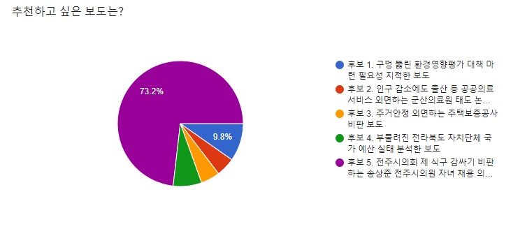 2020년 이달의 좋은 기사 1월 5개의 후보 중 KBS전주총국 서승신 취재기자, 한문현 촬영기자의 <전주시의회 제 식구 감싸기 비판하는 송상준 전주시의원 자녀 채용 의혹 연속 보도>가 73.2%로 2020년 1월의 좋은 기사로 선정되었음을 밝힙니다.