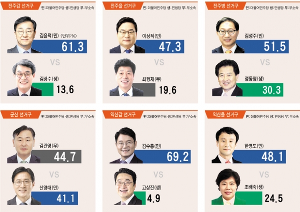 ※ 여론조사는 전북도민일보, 전라일보, 전주MBC, JTV 의뢰로 (주)코리아리서치인터내셔널이 3월 13일부터 3월 14일까지 전라북도 만18세 이상 성인 남녀(전주시갑 502명, 전주시을 502명, 전주시병 501명, 군산시 500명, 익산시갑 501명, 익산시을 502명)를 대상으로 하였으며, 유선RDD(Randdom Digit Dialing)와 무선가상전화 방식(전주시갑 유선 5.6%·무선 94.4%, 전주시을 유선 3.0%·무선 97.0%, 전주시병 유선 8.4%·무선 91.6%, 군산시 유선 7.6%·무선 92.4%, 익산시갑 유선 7.4%·무선 92.6%, 익산시을 유선 5.2%·무선 94.8%)으로 피조사자를 선정하여 전화면접조사방법으로 조사하였다. 가중보정을 위해 2020년 2월말 행정자치부 주민등록 인구기준으로 성별·연령별·지역별 가중값(셀가중)을 부여하였으며 응답률은 전주시갑 16.9%, 전주시을 12.9%, 전주시병 18.7%, 군산시 19.2%, 익산시갑 17.3%, 익산시을 16.5%에, 표본오차는 선거구별 95% 신뢰수준에서 ±4.4%p 이다. 그 밖의 사항은 중앙선거여론조사심의위원회 홈페이지를 참조하면 된다.