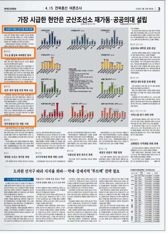 하지만 전북도민일보는 3월 19일 관련 내용을 보도하며 전주갑은 ‘구도심 활성화 최대현안 꼽아’라는 소제목을, 전주병은 ‘전주종합경기장 개발 기대’를 소제목으로 뽑았다. 실제 구도심 활성화는 전주갑에서 2번째로 뽑힌 현안이었고, ‘전주종합경기장 개발’은 전주병에서 4번째로 뽑힌 현안이다.
