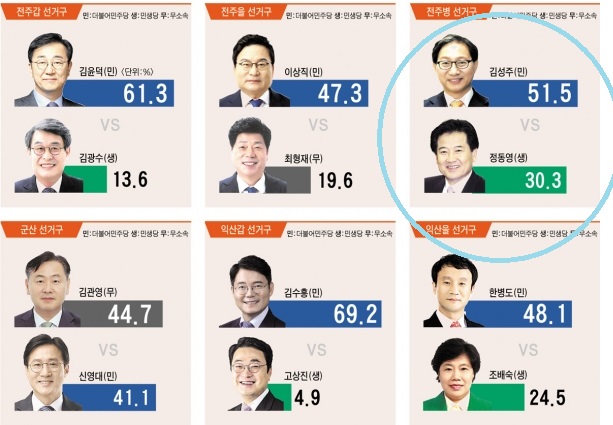 그러나 17일 자 전북도민일보가 1면에 사용한 그래프를 보면, 수치만큼의 차이가 반영되어 있다고 보기 어렵다. 특히 전주병 선거구(21.2% 차이)와 익산을 선거구(23.6%차이)는 수치 차이가 비슷한데도, 익산을 선거구는 차이가 눈에 띄도록 그래프가 그려진 반면 전주병 선거구는 그래프가 오차범위 내인 군산 선거구와 비슷하게 그려졌다. 전주갑 선거구(47.7% 차이)와 전주을 선거구(27.7% 차이)도 수치 차이는 20%지만 그래프는 두 선거구가 비슷하게 그려졌다.