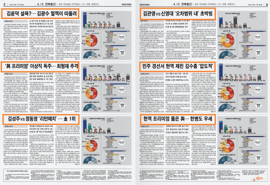 전북도민일보, 전라일보, 전주MBC, JTV 의뢰로 (주)코리아리서치인터내셔널이 3월 13일부터 3월 14일까지 전라북도 만18세 이상 성인 남녀(전주시갑 502명, 전주시을 502명, 전주시병 501명, 군산시 500명, 익산시갑 501명, 익산시을 502명)를 대상으로 하였으며, 유선RDD(Randdom Digit Dialing)와 무선가상전화 방식(전주시갑 유선 5.6%·무선 94.4%, 전주시을 유선 3.0%·무선 97.0%, 전주시병 유선 8.4%·무선 91.6%, 군산시 유선 7.6%·무선 92.4%, 익산시갑 유선 7.4%·무선 92.6%, 익산시을 유선 5.2%·무선 94.8%)으로 피조사자를 선정하여 전화면접조사방법으로 조사하였다. 가중보정을 위해 2020년 2월말 행정자치부 주민등록 인구기준으로 성별·연령별·지역별 가중값(셀가중)을 부여하였으며 응답률은 전주시갑 16.9%, 전주시을 12.9%, 전주시병 18.7%, 군산시 19.2%, 익산시갑 17.3%, 익산시을 16.5%에, 표본오차는 선거구별 95% 신뢰수준에서 ±4.4%p 이다. 그 밖의 사항은 중앙선거여론조사심의위원회 홈페이지를 참조하면 된다.