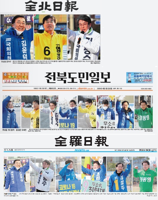이 외에도 전북일보는 <4․15총선 전북 4곳 ‘동문간 격돌’ 주목>(4월 3일, 4면)에서 전주갑, 전주병, 군산, 정읍고창후보자들 사진을 삽입해 동문 간 흥미를 유발하는 연고주의 보도를 냈다.