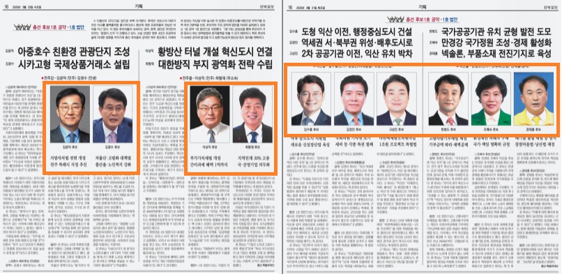 먼저 전북일보 <1호 공약, 1호 법안> 기획 보도는 “지난달 이후 실시된 각 언론사 여론조사를 바탕으로 지역구별 유력 후보 2명씩을 선정, 후보자의 주요 공약과 법안을 자세히 살펴본다. 범위는 1호 공약 1호 법안으로 국한했다”고 편집자 주에 밝히고 있다.