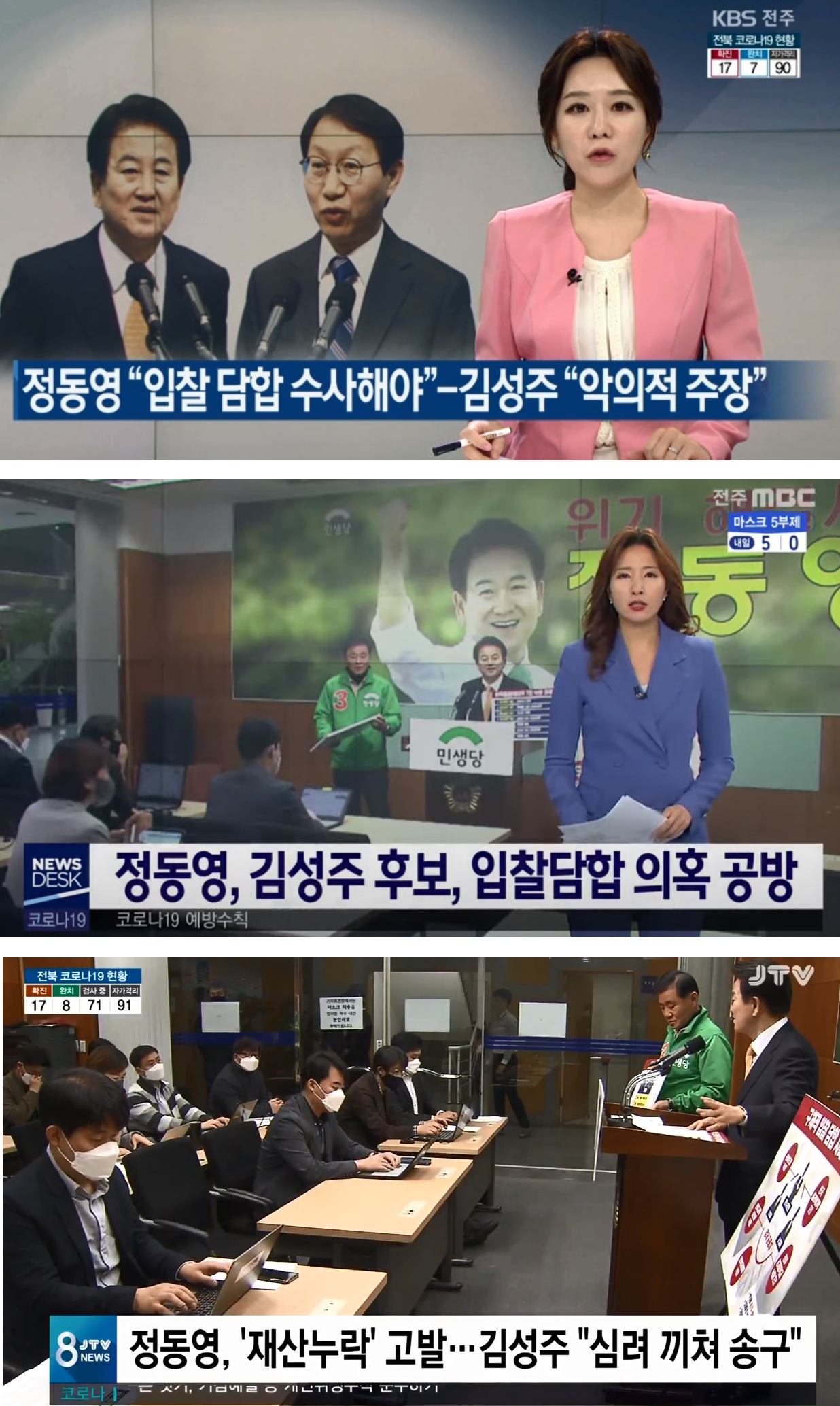 지난 3월 31일에는 무소속 임정엽 후보자가 기자회견을 통해 민주당 안호영 후보자의 친형의 후보 매수 위법 행위에 대한 해명을 촉구하며 공방 보도로 이어졌다. 특히, 전주병 선거구는 민생당 정동영 후보가 국민연금공단 이사장을 지낸 김성주 후보의 비리 의혹을 제기하면서 선거가 정책 대결에서 상대방 흠집내기 공방으로 바뀌는 양상이다. 의혹의 내용은 김성주 후보가 대주주로 있던 컴퓨터 판매·수리업체가 입찰 담합을 하고 재산을 누락했다는 것이다. 해당 보도는 아래와 같다.