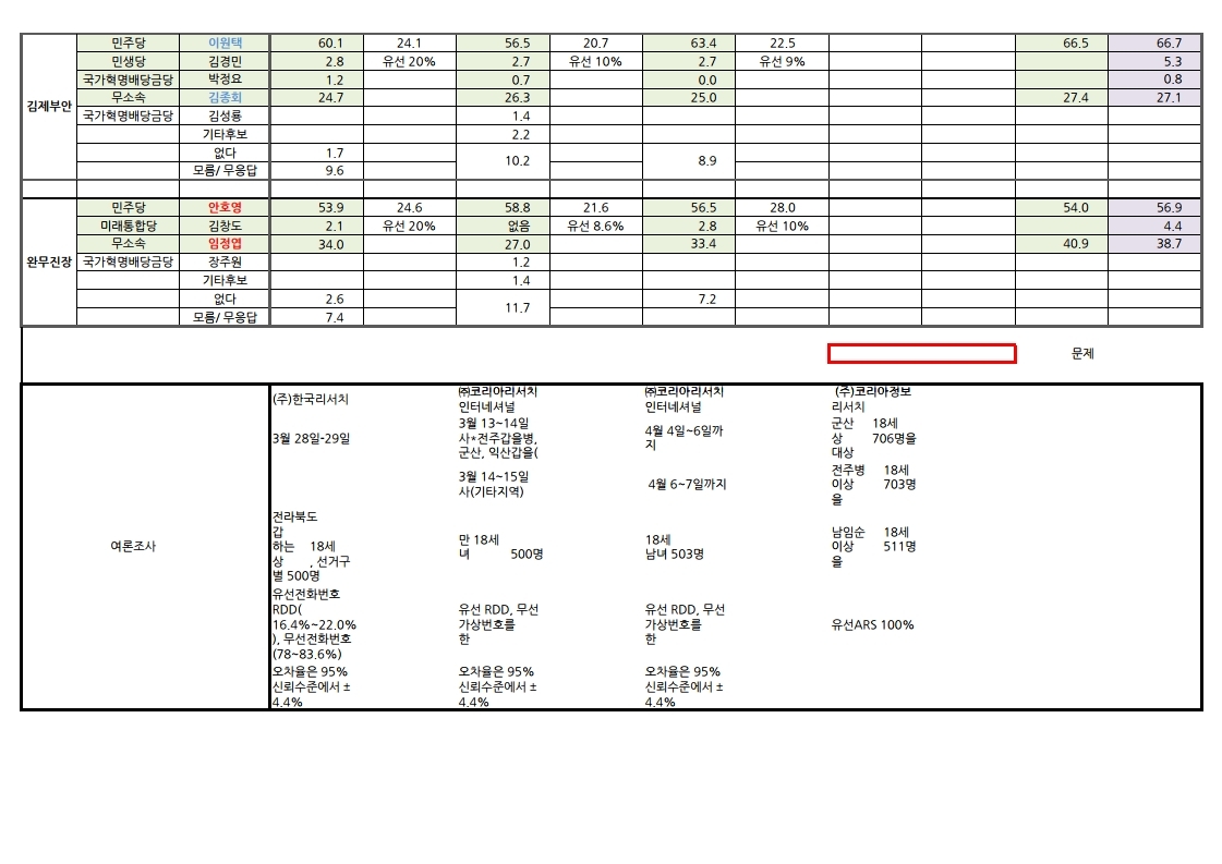 | [2020총선 전북 통신3사, 노컷뉴스 보고서 5차] 뉴시스 전북취재본부, 유선ARS 100% 여론조사 문제 보여줘. 여론조사 조사기간 오보. 서로 다른 여론조사도 비교 보도해 (0) | 2020.04.14 |