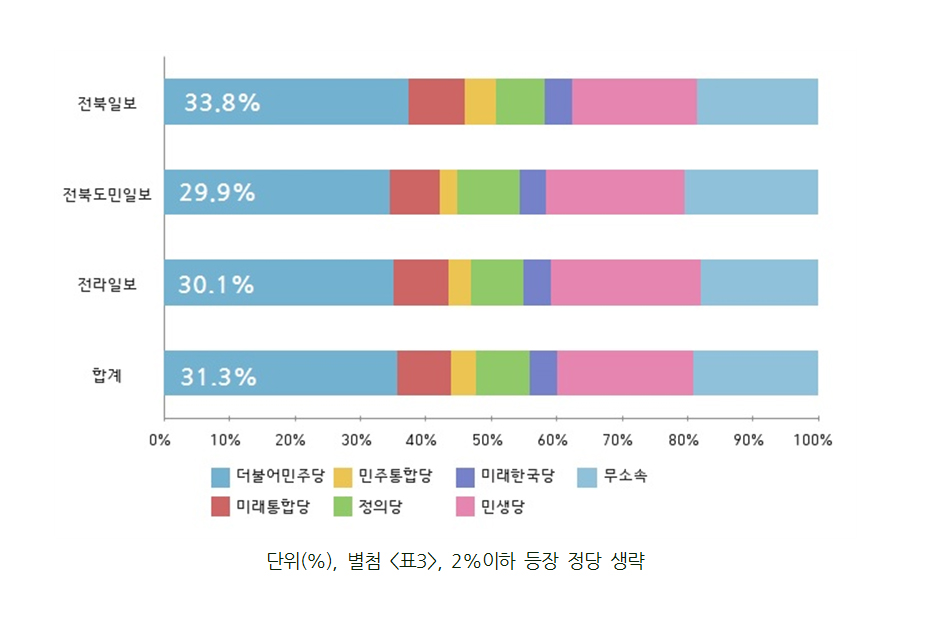 전북 일간지별 정당 보도 비중을 비교해 보면 보도 비중에 큰 차이를 드러나지는 않는다.