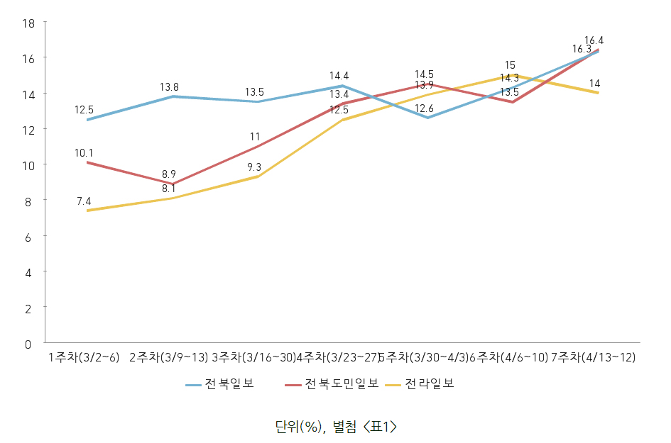 전북일보가 13.7%, 전북도민일보 12.2%, 전라일보 11.2% 순이다.