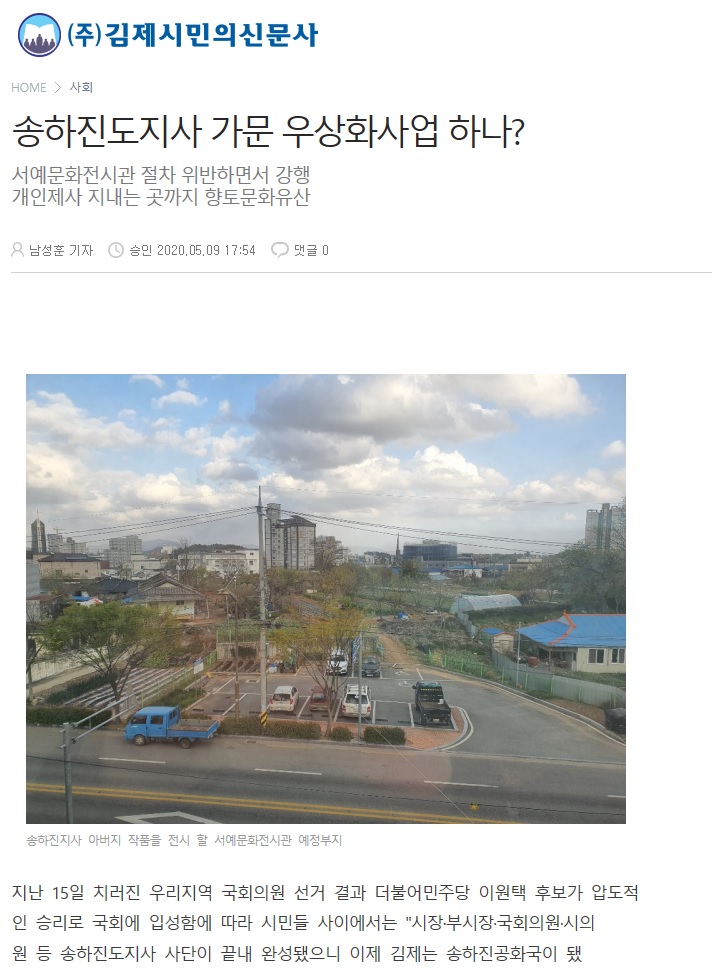 지난 3월 24일, 코로나19 관련 추경예산 명목으로 김제시가 제출한 예산안 412억 원이 김제시의회에 통과됐습니다. 그런데 김제시민의신문은 412억 원 중 직접적인 코로나19 관련 예산은 겨우 36억 원뿐이고 대부분은 박준배 김제시장의 공약 사업 예산이라고 보도했습니다. 김제시민의신문은 이 중 서예문화전시관 건립 사업에 집중했습니다. 기존 건립비 50억 원에, 토지 매입비 10억 원을 추가로 통과시켰다면서 송하진 도지사의 부친인 강암 송성용 선생을 기리기 위한 전시관 건립이 아니냐는 의혹을 제기했습니다. 또 송하진 도지사의 조부인 유재 송기면 선생의 묘역이 있는 요교정사의 향토문화유산 선정을 두고 “개인 제사를 지내는 곳까지 국민 세금이 쓰여야 하나?”라는 질문을 던지고 있습니다. 국민들의 세금이 잘못 쓰이고 있진 않은지 감시하고, 도정 총 책임자인 송하진 도지사를 향한 의혹을 제기하고 있기에 이달의 좋은 기사로 추천합니다.
