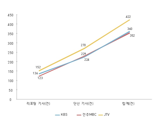 | 방송사 | 리포팅 기사(건) | 단신 기사(건) | 합계(건) |