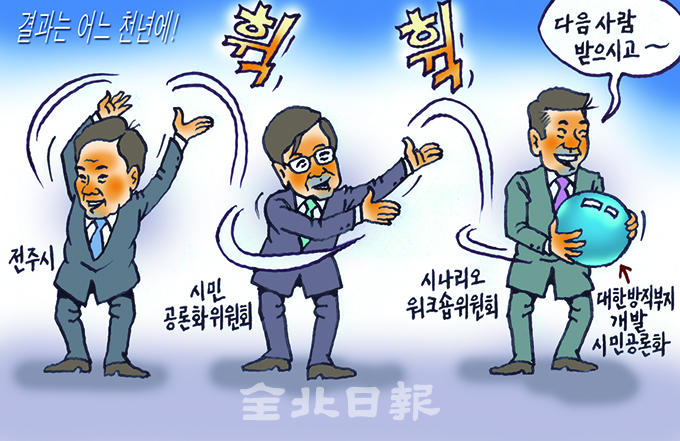 1. 전북일보가 전주 대한방직 부지 개발 공론화위원회 활동에 대한 부정적인 보도를 이어갔습니다. 공론화위원회가 여론수렴을 위해 전문가들과 시민들로 구성된 시나리오워크숍 추진단을 모집하기로 결정했는데, “결국 전주시의 결정 책임을 공론화위원회에서 다시 시나리오워크숍으로 떠넘기는 것 아니냐는 시각과 신중한 추진이라는 의견이 엇갈린다”라고 보도했습니다. 기사에서는 의견이 엇갈린다고 했지만 각 단체가 공론화가 적힌 공을 떠넘기는 만평을 통해 전북일보가 이번 결정을 바라보는 시각을 확인할 수 있습니다. 한편 전라일보와 KBS전주총국은 관련 내용을 정리하는 보도만 했습니다.