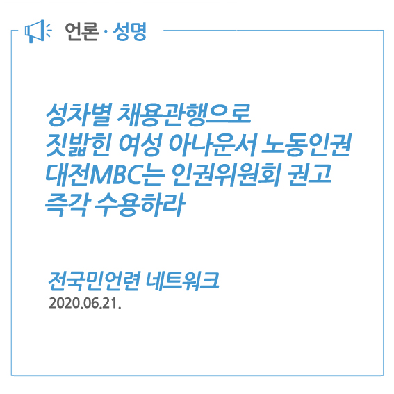 [전국 민언련 네트워크 성명] 성차별 채용관행으로 짓밟힌 여성 아나운서 노동인권 대전MBC는 인권위원회 권고 즉각 수용하라