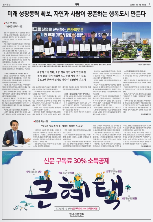 전북일보, 전북도민일보, 전라일보 지면 한 면에 민선 7기 2주년을 맞아 익산시정을 돌아보는 기사가 실렸다. 지역 신문은 민선 7기 2주년을 맞아 6월부터 전라북도와 14개 시군에 대한 기획 보도를 연이어 보도하고 있다. 우선 세 신문사가 어떻게 평가하고 있는지 살펴보자.