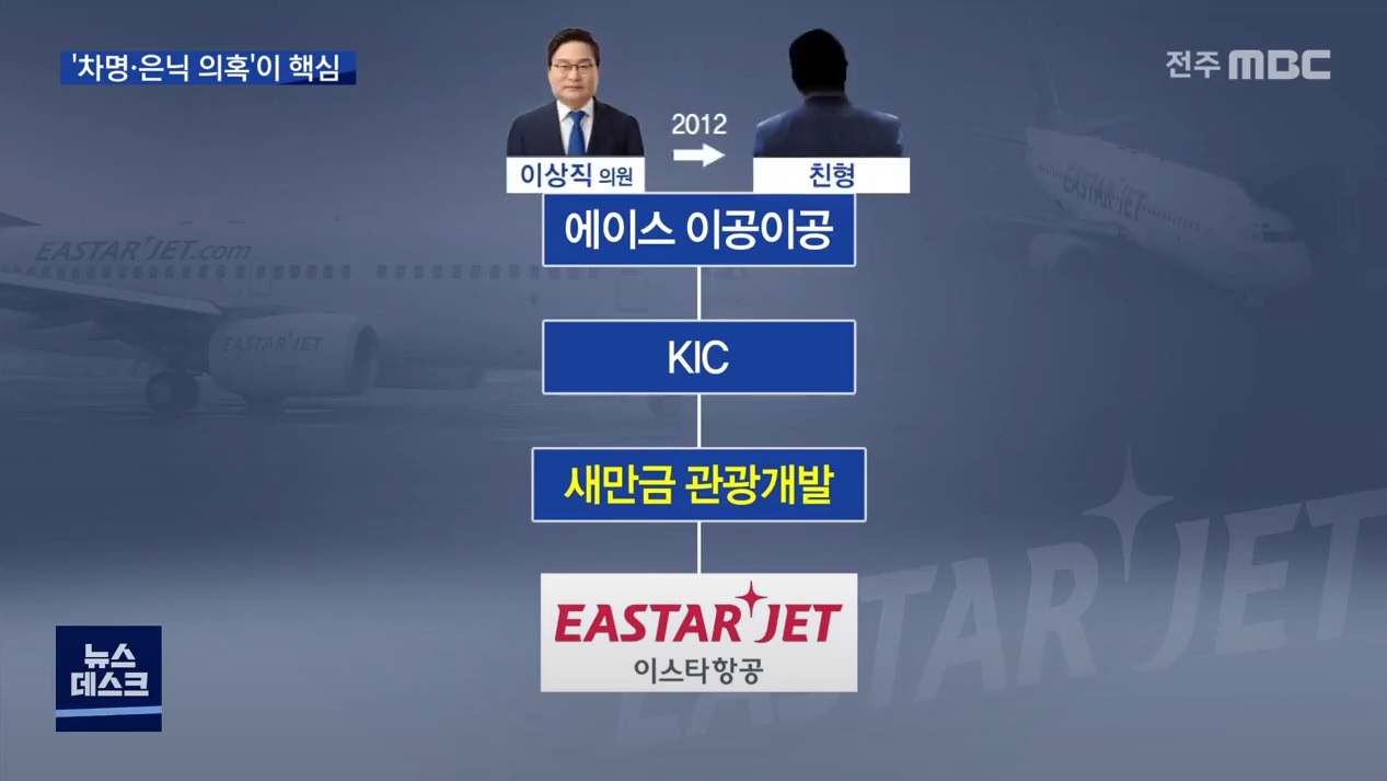 아무튼 이상직 의원은 새만금관광개발을 원래 보유했던 플랜트 회사 KIC에 종속기업으로 편입시켰는데, 이 사실을 주식시장에 공시하자 새만금 테마주로 각광받으면서 주식이 7배 이상 폭등하고, 이 돈으로 이스타항공을 창업했습니다. 전주MBC는 이 과정에서 정작 새만금관광개발이 계획했던 새만금 개발 사업은 전혀 진행되지 않았다고 지적했습니다. 또한 이스타항공 창업 후에도 본사를 군산에 두고 군산-김포 노선도 운항하겠다는 약속으로 군산시로부터 출자금 10억을 받았지만 약속을 지키지 않았다고 지적했습니다.