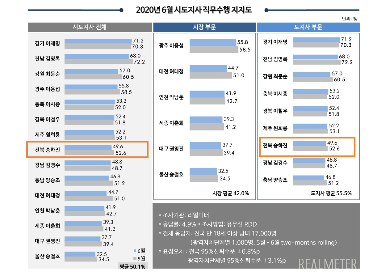 하지만 이상합니다. 지난 7월 15일 전북일보, 전북도민일보, 전라일보는 송하진 도지사 직무수행평가 결과를 ‘직무 잘하고 있다’, ‘긍정적’, ‘전국 3위’라는 내용으로 보도했는데, 어떻게 된 것일까요? 참고한 여론조사 기관이 다르기 때문입니다. 지역 일간지들이 참고한 여론조사는 리얼미터 조사 결과가 아닌 한국갤럽이 진행한 ‘2020년 상반기 광역자치단체장 직무수행 평가’였습니다.