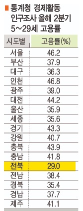 전북일보는 통계청이 발표한 각 지역별 국세징수(2019) 및 지역 내 총생산 현황(2018), 15~29세 고용률(2020년 2분기) 등의 경제지표를 살펴본 결과 전라북도의 경제 상황이 매우 안 좋다고 보도했습니다. 전라북도보다 인구가 적은 충북과 강원, 제주는 성장세를 기록해 큰 대조를 보이고 있다는 겁니다.